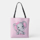 Um saco de tote com uma ilustração de aquarela de elefante rosa e fofinha. Ela tem orelhas bonitinhas, cor-de-rosa e bolinhas branca e arco bonito de fita rosa sobre a cabeça. O plano de fundo é rosa claro com bolinhas coloridas creme.