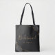 This elegant modern bridesmaid tote bag features a black watercolor agate design trimmed with gold faux glitter in two corners. The word "Bridesmaid" appears in gold-colored handwriting script on a dark off-black background. Add her name in gold-colored copperplate font.