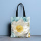 Elegante Flor Branca Simples Luxo Dourado Aquarela Sacolas Tote apresentam uma flor branca simples com sotaques de folha dourada estilosa em um fundo de aquarela azul suave. Presente perfeito para o Dia das Mães, aniversário, Natal, Apreciação ao Professor e melhores amigos. Criado por ©Evco Studio www.zazzle.com/store/evcostudio