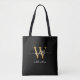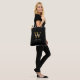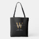 Bolsa de mão com monograma preto e dourado elegante e moderno com nome inicial personalizado. Este design apresenta seu primeiro nome em uma linda tipografia estilizada com rabiscos (ou caligrafia) com monograma inicial e sobrenome ou nome completo em dourado e branco sobre fundo preto. Ótimo presente feminino para aniversário, casamento, Natal, chá de noiva, festa de 16 anos, despedida de solteira ou para formatura. É para a garota que gosta de coisas minimalistas e limpas.
