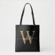 Bolsa de mão com monograma inicial preto e dourado elegante, simples e moderno com nome personalizado. Este design apresenta seu primeiro nome em uma linda tipografia de letra manuscrita com cauda rebuscada (ou caligrafia) com monograma inicial em dourado e branco sobre preto. Ótimo presente feminino para aniversário, casamento, Natal, chá de noiva, festa de aniversário de 16 anos, despedida de solteira ou para formatura. É para a garota que gosta de coisas minimalistas e limpas.