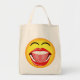 © Sunny Mars Design Face Custom Canvas Tote Bags - Esta bolsa de tote de mercearia legal, humorística, divertida e personalizada apresenta uma ilustração engraçada de um rosto amarelo risonho emoticon com uma boca grande e aberta, dentes claros e brancos, língua e olhos fechados. Conceito de humor.