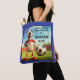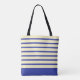Saco de tote engraçado com um cachorro no campo de futebol. No verso está um elegante design azul retrô e amarelo ensolarado com listras. Você também pode copiar e colar a imagem frontal no verso, se quiser. Esta bolsa é excelente para uma mãe de futebol e um presente adorável para o seu aniversário ou Dia de as mães.