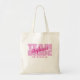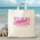 O design personalizado da bolsa de tote para o seu grupo de noivas apresenta "EQUIPE NOIVA" em negrito tipo rosa claro. Personalize o nome da dama de honra em script rosa escuro brilhante coordenado. O título ou texto personalizado é apresentado abaixo. Todas as cores neste design são personalizáveis na área de ferramenta de design da Zazzle! O design se repete na parte de trás.