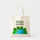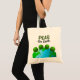 Engraçado Pun Peas na Terra em letras negras e verdes no topo da design. Abaixo estão quatro adoráveis ervilhas verdes redondas com olhos ovais pretos e sorrisos bonitos, sentados sobre a terra.