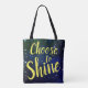 Um saco de tote distante com um fundo estrelado e as palavras "Escolher Brilhar" em um roteiro amarelo.