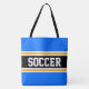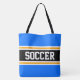 Este esportivo, design atlético, apresenta dentro de texto ousado SOCCER, uma faixa preta de centro largo com pinstripes brancas e amarelas contra listras externas azuis brilhantes. O texto pode ser personalizado.