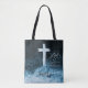 Mostre o poder do Cristo quando você vestir esta cruz sobre a Escritura Azul Escuro-d'água Personalizada Tote Bag apresentando uma poderosa cena de uma cruz robusta sobre águas tempestuosas. A cena atordoante lembra Jesus, tendo autoridade sobre a natureza e toda a criação, chamada as ondas com apenas três palavras "paz, estar ainda". O verso Bíblia de Mateus 8:26 nos lembra como o Senhor "rebentou os ventos e o mar". Faz um presente personalizável de excelente para esposa, mãe, filha, irmã ou a mulher na sua vida que ama o Jesus Cristo. Perfeito como um Dia de as mães encorajador e inspirador ou presente de aniversário.