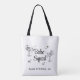 Sacolas brancas femininas e fofas para a sua festa de solteira com esboços de garotas de festa glamorosas tomando sol em copos de martini de coquetel, estrelas retrô, "Babe Squad" em um script retrô da moda e o local da festa ou outro texto em letras simples e modernas.