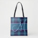 Saco de mão com nome personalizado moderno xadrez azul elegante e moderno, personalizável, apresenta "monograma e nome personalizados" em um fundo xadrez azul celadão / azul escuro.
