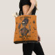 Esta bolsa de tote laranja do Halloween apresenta uma cena engraçada e sarcástica, com uma menina de esqueleto de café gelado, cercada por morcegos e estrelas, que declara "Eu pretendo assombrar pessoas quando eu morrer, eu tenho uma lista."