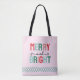 Feliz e Brilho! Saco de tote festivo com tons de rosa e verde.