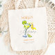 A bolsa tote do fim de semana da noiva exibe um vibrante copo de margarita em aquarela e uma fatia de limão à esquerda, capturando perfeitamente o tema "Margs & Matrimony". O design adota um estilo minimalista, com acentos coloridos que equilibram diversão e elegância, refletindo o tom comemorativo do evento.