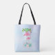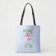 Saco de tota com ilustração de um flamingo rosa-mamã e bebê em pé num leito de flores florais suculentas com palmeiras verdes balançando nas costas. Tropical e bonito. O fundo é uma aquarela azul-claro de verão com pistas de púrpura.
