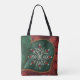 Folheto de Natal Design verde e vermelhos com floco de neve com Dourada borda de ponta Adicione um toque festivo ao seu decoro de Natal com esta bolsa de Tote com tema de Natal. Apresentando um padrão floral verde e vermelho impressionante, um design central em floco de neve com detalhamento intrincado em ouro e uma bela borda de ouro costurada,