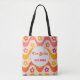 Esta é uma bolsa customizada retro floral para chuveiros de noiva com um padrão muito fofo de flores vintage em ondas abstratas e groovy em rosa, laranja, amarelo e roxo. você pode alterar o nome e a data na bolsa usando o modelo personalizado.