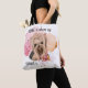 Esta bolsa de tote apresenta um adorável bronzeado e cinza Yorkie Dog com grandes olhos castanhos.A imagem é colocada num fundo cor-de-rosa abstrato e aquarela bronzeada com uma sutil imagem rosa rosa rosa num dos lados. Um buquê de flores cor-de-rosa e douradas também está no canto inferior direito. O texto da cinza acima e abaixo da imagem diz "HOME é onde está meu YORKIE." A parte de trás do saco tem o cão e a imagem floral sem o texto.