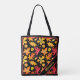 Folhas impressionantes do outono caem graciosamente no chão, contra um fundo preto. A borda tem uma faixa laranja a andar por toda a volta. No canto inferior direito há um banner diagonal em preto com uma borda laranja, onde você personaliza com seu nome em um script amarelo moderno. Que saco de tote tão bonito e divertido para a temporada de outono! Excelente para viagens rápidas ao mercado de agricultores, para viagens noturnas e muito mais.