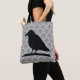 Esta bolsa de tota tem uma silhueta de pássaro corvo sobre um fundo de cor damasco de cinza.