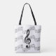Três funcionarios ondulantes de música por trás de uma clave tripla. Este branco sobre design gráfico preto irá encantar o amante ou músico da música. Design por SusanEileenEvans