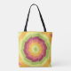 Esta imagem apresenta um padrão caleidoscópio espiral vibrante. O design é composto por bandas concêntricas, ziguezagelantes, em tons quentes e úmidos, incluindo amarelo, verde, rosa e marrom, misturadas para fora do centro como uma flor estilizada ou uma explosão de sol. O efeito é dinâmico e hipnótico, atraindo o olhar do espectador para o centro e irradiando uma vibração retrorada, quase psicodélica