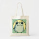 Cute tote bag featuring a funny green cartoon frog with big eyes and a deadpan look on his face on a yellow and green background.