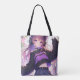 Saco personalizado. Menina de anime bonita vestindo fones de ouvido com orelhas de gato e um suéter roxo e preto. C