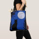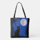Saco numa silhueta de um gato, olhando para uma lua de cheio num céu estrelado azul profundo