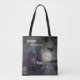 O Halloween assombrado personalizou a bolsa de tote apresentando uma paisagem noturna com gato preto, aranha e morcego na lua de cheio. Na árvore estão sutis luzes de festas.