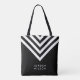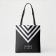 Saco de tota minimalista moderno, com design geométrico branco de chevron contra fundo preto, que você pode personalizar com seu nome. Excelente como presentes para a família e amigos ou para você mesmo. Personalize-o substituindo o texto do marcador de posição. Para obter mais opções, como alterar a fonte e seu tamanho, clique no botão "Personalizar". *Observe que a Marca d'água do Zazzle que aparece na visualização de zoom NÃO aparecerá no produto impresso final. © Rosewood e Citrus