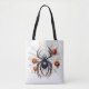 Nessa única bolsa de tote, uma gigante aranha-da-velha negra pegou abóboras laranja em sua teia. Apropriado para a época das bruxas, mas poderia ser usado durante todo o ano. A mesma imagem é impressa em ambos os lados do saco.
