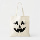 Esta bolsa de tote de Halloween apresenta uma face de abóbora gira, preta e laranja com sorriso divertido e pestanas flertas.