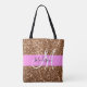 O brilho e a cintilação rosada e bronze brilha o nome do monograma branco e o saco inicial de tote. Seu nome personalizado e monograma são escritos em um elegante roteiro escrito à mão com um fundo rosa. Você pode alterar a cor do texto, o estilo e o tamanho da fonte usando a opção personalizar. Um aniversário perfeito ou presente de Natal!