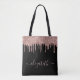 Saco de tote preto elegante e giro personalizado com brilho de rosa dourado gotejante. Personalize com seu nome em um roteiro de luz rosa-ouro de tendência na moda com baloiços.