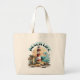 Bolsa de praia personalizada. Ilustração de uma cena de praia com farol, pranchas, palmeiras e golfinhos.