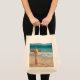 Send warm Easter greetings with this tropical-themed grocery tote bag. The design features a wooden cross with yellow Easter lilies, delicate pink ribbon, and scattered flower petals in the sand with the turquoise ocean in the background. The beautiful script text reads "Happy Easter." The same design is repeated on the backside. The tote bag is available in various size options. Please browse our complete collection of tropical-themed Easter cards, gifts, and home decor. Special design requests accepted.