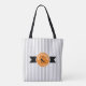 Este saco de tote legal apresenta um gato preto de Halloween num rótulo laranja e preto com o texto "Feliz Dia das Bruxas" em branco. Personalize com seu nome ou outro texto. O fundo é um padrão estreito de listras brancas e pretas. Procure ID686 para ver outros produtos com este design.