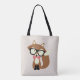 Ilustração vetorial adorável de uma raposa marrom, que veste um par sobredimensionado de óculos de leitura e uma gravata arco rosa sobre fundo bege. Adicione um nome ou monograma para um presente de um tipo.