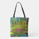 Tote bag printed with a beautiful image of a lake in paint.