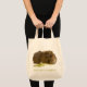 Esta bolsa de tote mostra minha fotografia de perto de um porco-cobaia tawny comendo aipo com texto abaixo lendo "Coma mais vegetais!". Preencha o campo modelo, remova o texto ou clique na opção personalizar para selecionar um estilo de tipo, tamanho e cor desejados.