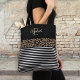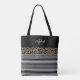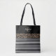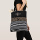 Uma elegante impressão de um animal leopardo preto e uma bolsa de tote de monograma listrada a preto e branco para o dia a dia ou de volta à escola. Adicione seu nome e inicial à frente e atrás. Projetado para você pelo Blackberry Boulevard.