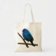 Esta bolsa de tote mostra o espetacular indígena Bunting masculino preso em um galho. Este pássaro minúsculo não é visto com frequência. Ele é tímido e tende a evitar humanos. Seu hábitat é fazenda, áreas de pincel e florestas abertas. Ele tem penas azuis incrivelmente brilhantes e iridescentes e uma canção muito doce. A fêmea é bonita, mas uma cor marrom sem graça.