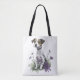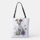 O comportamento gentil do cão Jack Russell é lindamente acentuado pelas bonito flores roxas, oferecendo uma cena pacífica que é perfeita para qualquer amante de cachorro ou entusiasta da natureza.