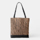 Lined tote bag with all-over knitting print. Camel brown rib stitch knitting wraps around this bag, with black trim on the bottom to match the handles. Include personalization on one side, with name, or saying in script with black shadow. Sample wording is, "Elizabeth's Wool" in off-white color. Text is on one side only, or delete the sample to order blank.