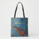 Esta bolsa de tota tem uma ilustração da lagosta viva no oceano colocada sobre um fundo azul com sotaques de algas e corais. O saco está pronto para ser personalizado com um nome em letras verdes limões em negrito.