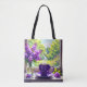 Um saco bonito com uma ilustração linda de lilases roxas vibrantes sentados num vaso de vidro, junto a uma xícara de vapor de café quente num dia brilhante de Verão.