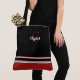 Uma bolsa chic e moderna com bloqueio de cores ousadas e personalização elegante. Este design apresenta listras pretas, vermelhas e brancas nítidas sobre uma silhueta de lona clássica, com uma inicial vermelha decorativa e seu nome personalizado em caligrafia branca.