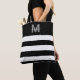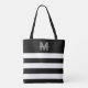 Bolsa de mão com monograma personalizado em elegante preto e branco com listras e script moderno. Adicione um toque de sofisticação e estilo moderno ao seu visual diário com esta bolsa de mão chic. Com uma inicial cinza elegante centrada em um fundo preto nítido, e um monograma de nome em script elegante no topo, esta bolsa é realçada por listras grossas pretas e brancas na parte inferior, adicionando um toque moderno ao design. A combinação de elegância e praticidade torna-a perfeita para carregar itens essenciais para o trabalho, escola ou um dia fora. Ideal para profissionais de negócios, estudantes ou qualquer pessoa que aprecie acessórios elegantes e funcionais, esta bolsa também é um presente atencioso para aniversários, feriados, Dia das Mães ou qualquer ocasião especial. Uma adição polida, funcional e elegante aos seus itens essenciais diários.