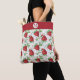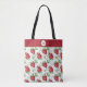 Esta bolsa de tote atraente apresenta um bonito padrão de morangos vermelhos brilhantes com folhas verdes. Para lhe dar uma reviravolta moderna, as imagens de morango e folha verde são colocadas sobre um fundo branco com minúsculas pinturas vermelhas e verdes. Na parte superior da bolsa há uma borda vermelha correspondente com uma faixa de círculo branca que segura o seu monograma. Ambos os lados do saco têm o mesmo padrão e borda.