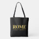 O saco de totas Lux apresenta coordenadas de Roma, Itália, latitude e longitude, em fontes douradas sobre fundo preto.